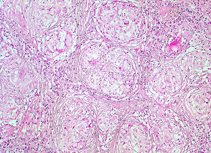 Späteres Stadium einer Sarkoidose. Für Sarkoidose typische konzentrische Fibrose in der Peripherie der Granulome. Das Parenchym des Lymphknotens ist verdrängt. Die Granulome stehen Rücken an Rücken und konfluieren nicht.