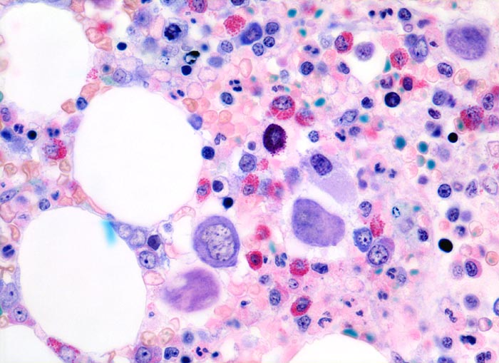 Vorstufen der Myeloposes mit rot granuliertem Zytoplasma. Megakaryozyten. Eine Mastzelle mit basophil granuliertem Zytoplasma. Segmentkernige reife Granulozyten.