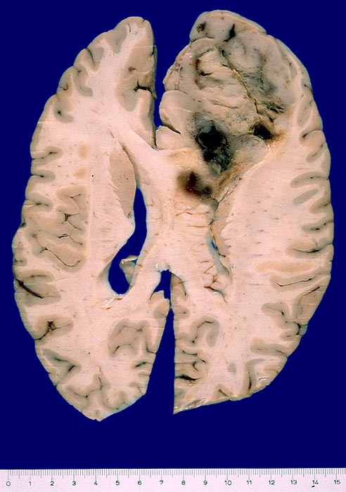 Grauer unscharf begrenzter Tumor frontal rechts mit fokalen Einblutungen.