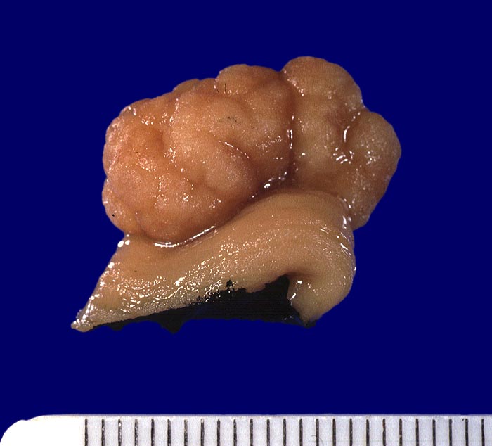 Auf einem kurzen Stiel sitzender polypoider Tumor mit gyrierter Oberfläche.
