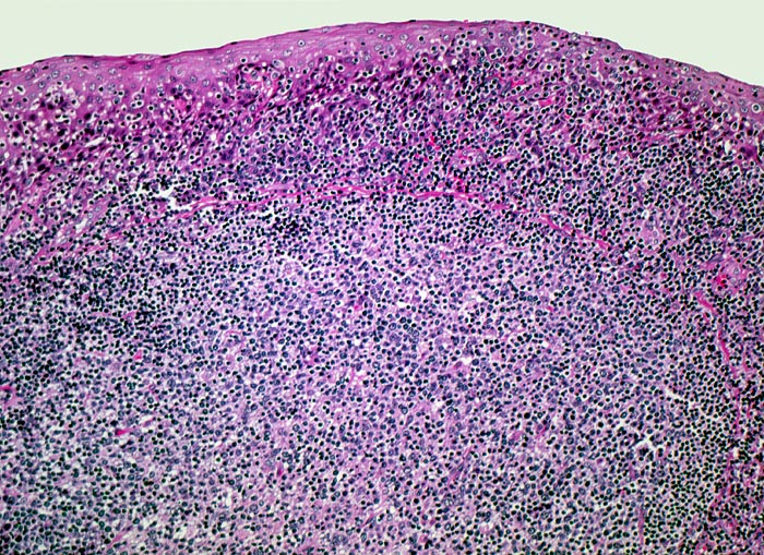 Ein sekundärer Lymphfollikel mit Keimzentrum wird bedeckt von Plattenepithel der Mundschleimhaut. Zahlreiche Lymphozyten infiltrieren das darüberliegende Epithel, was in der Tonsille ein Normalbefund darstellt.