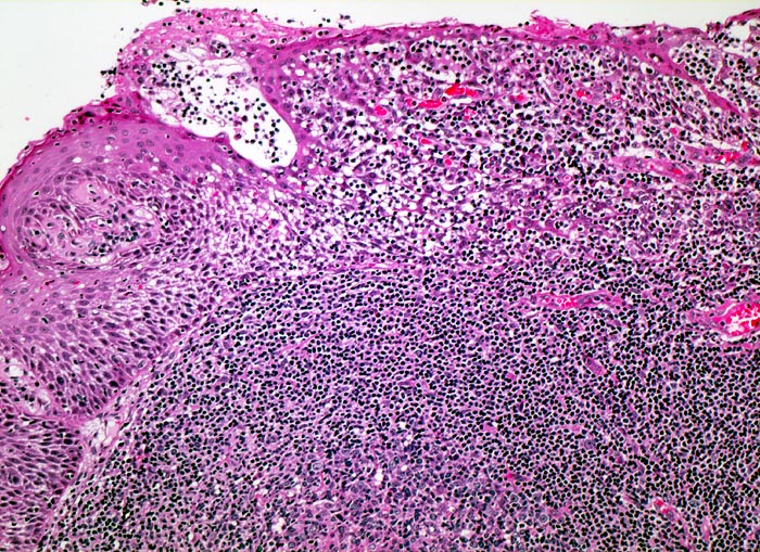 Ein sekundärer Lymphfollikel mit angeschnittenem Keimzentrum wird bedeckt von Plattenepithel der Mundschleimhaut. Zahlreiche Lymphozyten infiltrieren das darüberliegende Epithel, was in der Tonsille ein Normalbefund darstellt.