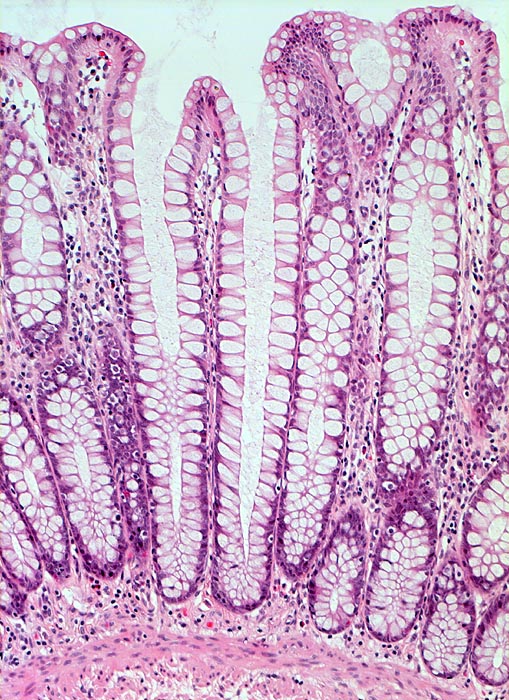 Die regelmässig angeordneten parallel ausgerichteten Krypten erinnern in ihrer Form an Reagenzgläser. Das Epithel besteht zur Hauptsache aus Becherzellen. In der Proliferationszone an der Kryptenbasis sind die Zellen wegen der höheren Kern-Zytoplasmarelation etwas dunkler gefärbt.