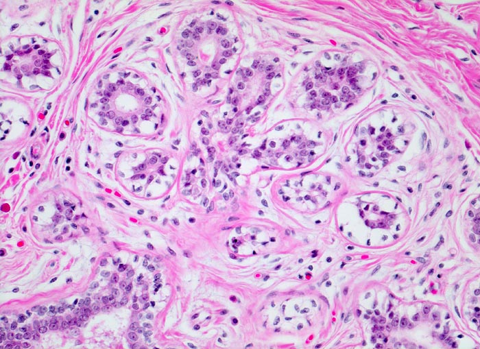 Die terminale duktulolobuläre Einheit der Mamma umfasst einen intralobulären Ausführgang und zu einem Läppchen angeordnete Alveolen. Alveolen und Ausführgang werden vom gleichen zweischichtigen Epithel ausgekleidet. Das intralobuläre kollagenfasrige Gewebe ist etwas lockerer als das extralobuläre.