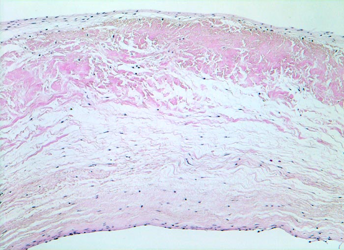 Ein Grossteil der Klappe besteht aus lockerem kollagenfasrigem Gewebe und ungefärbten Glykosaminoglykanen zwischen den Kollagenfasern. Die elastischen Fasern sind in dieser Färbung nicht erkennbar. Das Klappengerüst ist von einer flachen Endothelschicht bedeckt.