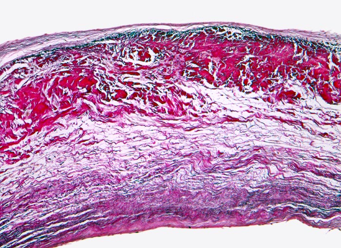 Zentral die aus dichtem kollagenfasrigem Bindegewebe bestehende Fibrosa. Diese ist beidseitig von einer Lage schwarzen fibroelastischen Gewebes bedeckt und aussen mit flachen Endothelzellen besetzt.