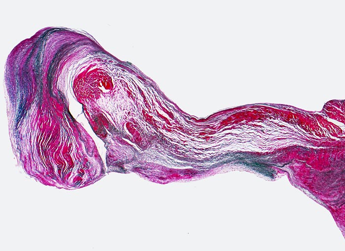 Kollagenfasriges Klappengerüst mit schwarzen elastischen Fasern zu beiden Seiten. Der Klappenschliessungsrand ist leicht verdickt.