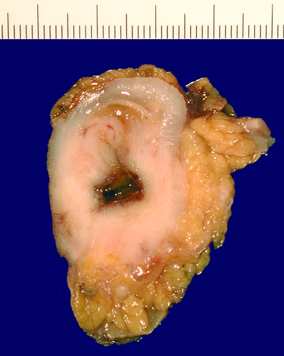 Querschnitt durch den zirkulär wachsenden Tumor. Tumorinfiltration des subserösen Fettgewebes.