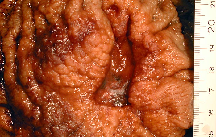 exulzerierter Tumor mit einer Grösse von 5x3cm. Dm der palpatorisch indurierten Magenschleimhaut insgesamt bis 11cm, bis in den Korpus-Antrumübergang reichend
