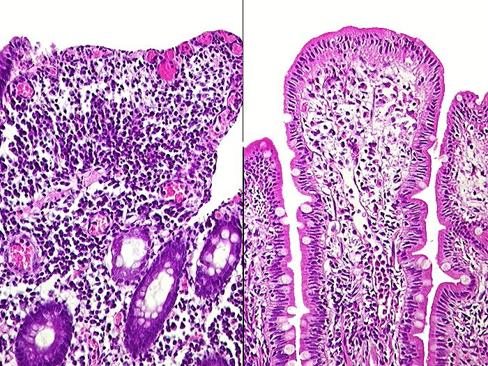 Beide Bilder stammen aus derselben Biopsie der Dünndarmanastomose. Rechts praktisch normale Dünndarmschleimhaut. Links verplumte oberflächlich erodierte Zotten.