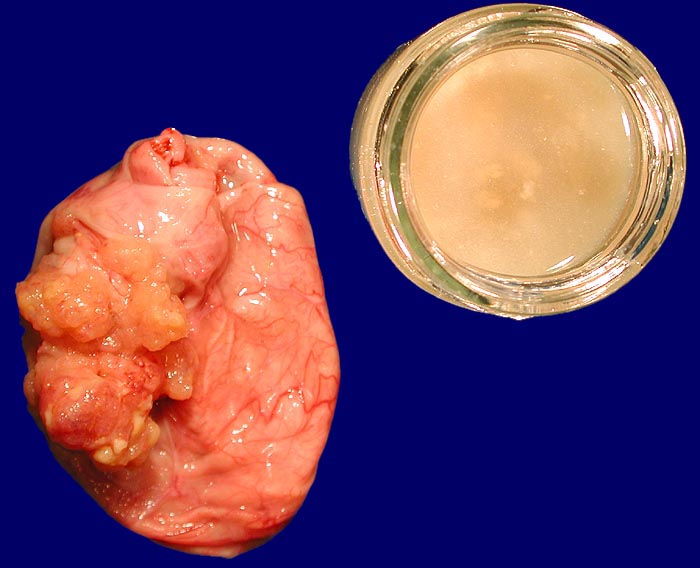 Ein 12,5x10x5cm grosses Ovar mit glatter Oberfläche. 455g schwer. Zysteninhalt trübe, leicht fadenziehend. Zysteninnenwand mit polypösem Gebilde von 4.5cm Durchmesser.