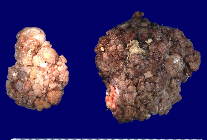 Beidseitiger blumenkohlförmiger papillärer gelbbrauner Ovarialtumor.