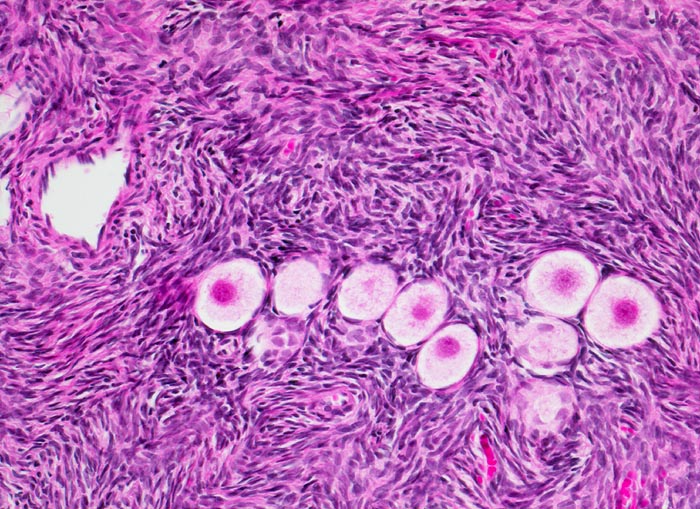 Primordialfollikel umgeben von einer einzelnen Schicht flacher Follikelzellen (spätere Granulosazellen). Die Keimzellen sind eingebettet in ein zellreiches spindelförmiges kortikales Stroma.