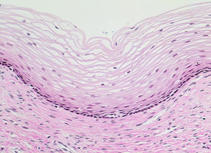 Mehrschichtiges unverhorntes Plattenepithel. Normale Ausreifung von den basalen zu den apikalen Zellen mit zunehmender Verkleinerung der Kerne. Dichtes entzündungsfreies Stroma.
