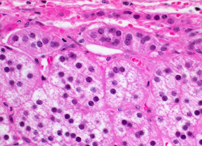 Zona glomerulosa: kleine eosinophile Zellen mit dunklem Kern; Zellnester. Bildungsort für Mineralocorticoide.