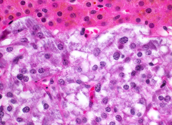 Zona reticularis: Eosinophile Zellen mit braunem intrazytoplasmatischem Lipofuszinpigment. Nebennierenmark: basophile Zellen mit reichlich Zytoplasma bilden Zellballen.