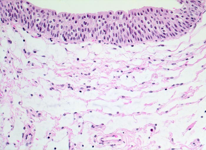 Regelmässig geschichtetes Urothel ohne Atypien. Lockeres subepitheliales Stroma.