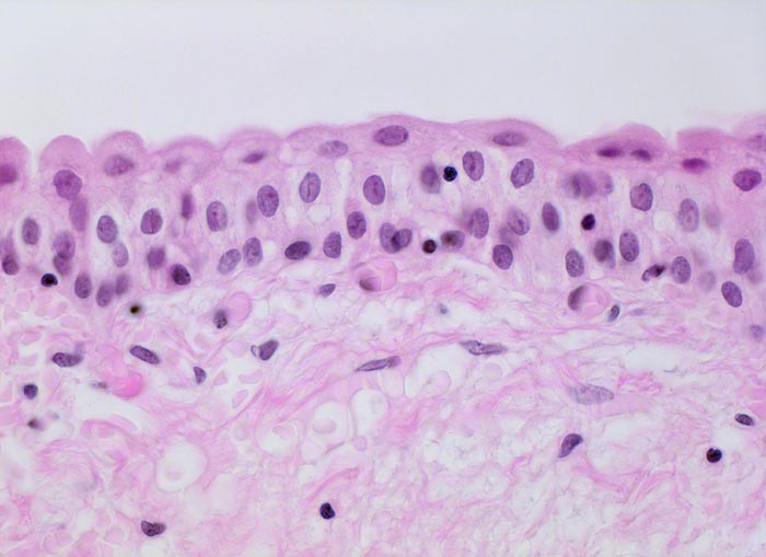Regelmässig geschichtetes mehrreihiges Urothel ohne Atypien. Das Epithel wird luminalwärts abgeschlossen durch die etwas dunkler gefärbte Deckzellschicht mit horizontal ausgerichteten Kernen. Einzelne intramucosale Lymphozyten (gehören zum Mucosa-assoziierten lymphatischen System). Lockere Submukosa mit vereinzelten Entzündungszellen.