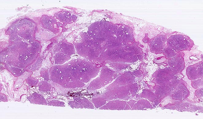 Pankreasparenchym und Fettgewebe werden von unregelmässigen Nekrosestrassen durchzogen. Bevorzugt ist das interlobuläre Fettgewebe von den autodigestiven Nekrosen betroffen. Die Nekroseareale werden gegen aussen begrenzt durch einen feinen hämorrhagischen Randsaum. Zentrale Parenchymanteile (violett) sind noch vital.