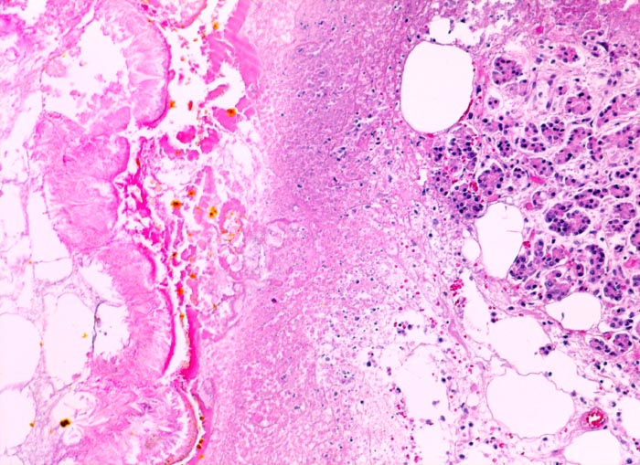 Rechts im Bild vitales Pankreasparenchym. In der Mitte folgt eine unscharf begrenzte Nekrose bestehend aus nekrotischem Detritus und Kerntrümmern. Links im Bild nekrotisches Fettgewebe. Die gelben Flecken entsprechen Hämatoidin.