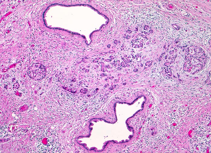 Zwischen zwei dilatierten Pankreasgängen ist ein stark fibrosiertes Pankreasläppchen mit atrophen Acini erkennbar. Daneben ist eine erhaltene Insel erkennbar. Das Parenchym ist stark fibrosiert. Die andeutungsweise erkennbare Läppchenarchitektur und die fehlenden Zellatypien helfen zur Abgrenzung des entzündlich veränderten atrophen Parenchyms von einem Tumorinfiltrat (ungeordnete Drüsenschläuche).