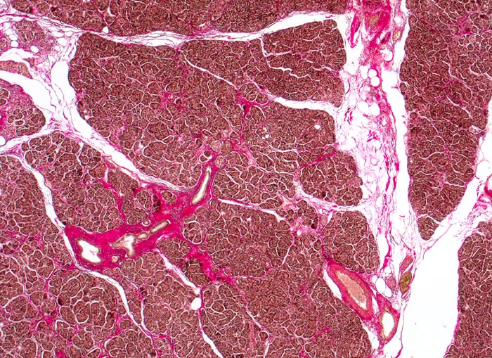 In der Übersicht wird die Lobulierung des Pankreasparenchyms sichtbar. Zwischen den Läppchen verlaufen schmale Bindegewebssepten mit Ausführungsgängen und Gefässen.