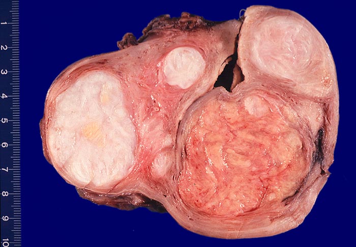Mehrere scharf begrenzte weisse Knoten mit wirbliger Struktur (Fibroleiomyome). Einer der Knoten weist zusätzlich gelbe Verkalkungsherde auf. Einer der Knoten weist eine auffallend gelbe Farbe auf, welche auf die Einlagerung von Fettzellen in den glattmuskulären Tumor zurückzuführen ist (Lipoleiomyom).