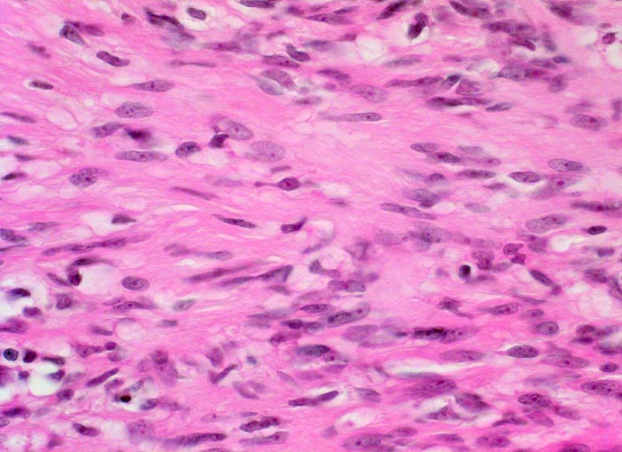 Kompakte spindelzellige parallel ausgerichtete Tumorzellverbände (Antoni A Muster).