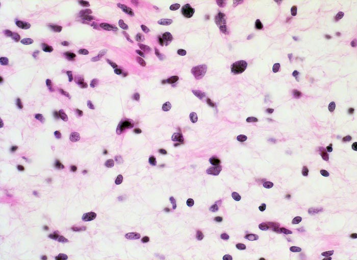 Lockerer Tumorzellverband mit runden Kernen und spinnwebenartigen Zellfortsätzen. Ein Teil der Zellkerne ist hyperchromatisch (Zeichen der Degeneration). Einige weisen intranukleäre Zytoplasmaeinschlüsse auf.