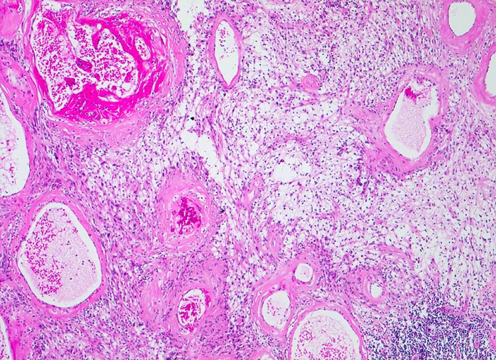 Tumor mit hyalinisierten ektatischen Gefässen mit älteren Thrombosen. Biphasischer Tumor mit kompakten spindelzelligen parallel ausgerichteten Tumorzellverbänden (Antoni A Muster, rund um die Gefässe) und lockeren Verbänden von Zellen mit runden Kernen und spinnwebenartigen Zellfortsätzen (Antoni B Muster). Fokales lymphozytäres Entzündungsinfiltrat.