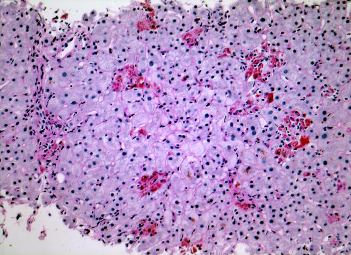 Die lobuläre Entzündung ist nur noch gering ausgeprägt. An die Stelle von fleckigen Nekrosen sind Ansammlungen von rot gefärbten mit Zeroidpigment beladenen Makrophagen getreten, welche die nekrotischen Hepatozyten abgebaut haben. Das Portalfeld links im Bild enthält abgesehen von den Histiozyten keine Entzündungszellen.