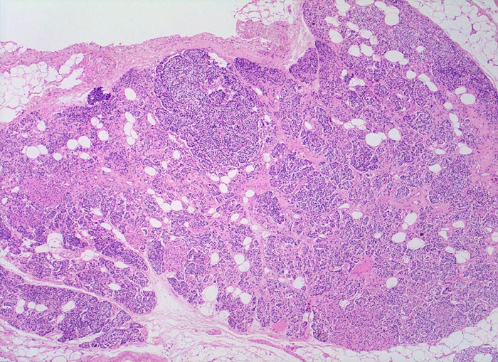 Bei Erwachsenen beträgt die Menge des stromalen Fettgewebes zwischen 10 und 30 Prozent (hier etwa 10%). Die Nebenschilddrüsen ist umgeben von einer schmalen bindegewebigen Kapsel. Ausgehend von der Kapsel ziehen schmale fibröse Trabekel in das Parenchym. Die oxyphilen Zellen bilden kleine rosarote Knoten innerhalb der grösseren Masse basophiler Hauptzellen.