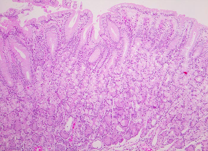 Wegen der fehlenden Entzündung ist das Stroma (=Lamina propria) zwischen den magenspezifischen Drüsen und den Foveolae kaum erkennbar. Die Belegzellen sind an ihrem hellen Zytoplasma und ihrer kugeligen Form erkennbar, die Hauptzellen an ihrem eosinophilen Zytoplasma und die Nebenzellen an den basalständigen Kernen.