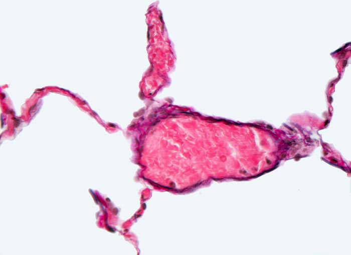 Die Alveolarsepten sind sehr schlank. Die Wanddicke der Lungenvene macht weniger als 5% des gesamten Gefässdurchmessers aus. Die Vene verläuft ausserhalb der Luftwege (im Gegensatz zu den Pulmonalarterien).