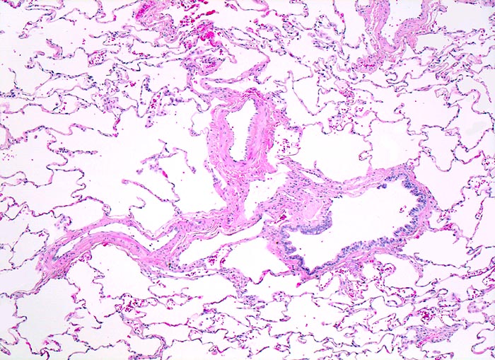 Lungenarterienäste verlaufen zusammen mit den Luftwegen. Im Bild ein
