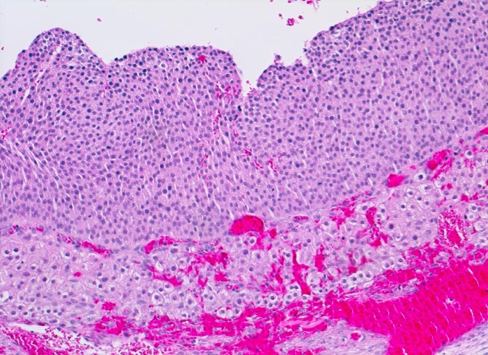 Zum Follikellumen hin eine breite Schicht von kleinen Granulosazellen. Gegen aussen folgt die stark vaskularisierte Theca interna mit grösseren luteinisierten Zellen.