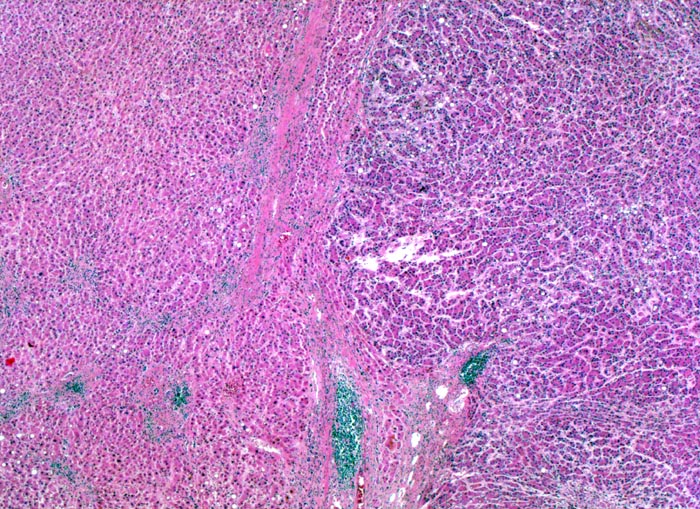 Das Leberparenchym links im Bild zeigt entzündlich infiltrierte und fibrosierte Portalfelder als Folge der chronischen Hepatitis C. Der scharf begrenzte, unbekapselte Tumor rechts im Bild ist aufgrund der höheren Kern-Zytoplasmarelation mit erhöhter Zelldichte dunkler gefärbt. Innerhalb des Tumors fehlen Portalfelder. Die Tumorzellen bilden schmale Trabekel.