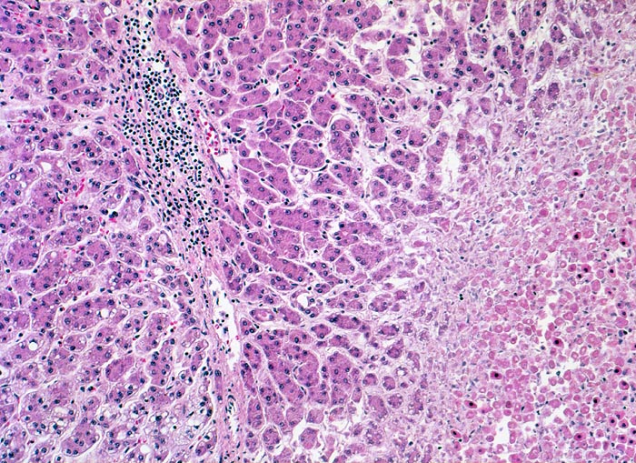 Die Tumortrabekel sind in diesem Tumorabschnitt lediglich zwei Zellen breit. Lediglich die minimalen Zellatypien (verminderte Menge basophiles Zytoplasma, geringe Kernatypien) ermöglichen die Unterscheidung von einem Leberzelladenom. Das Tumorgewebe enthält fibröse entzündlich infiltrierte Septen mit Gefässen. Portalfelder mit Gallengängen fehlen. Das nekrotische Tumorgewebe ist heller gefärbt.