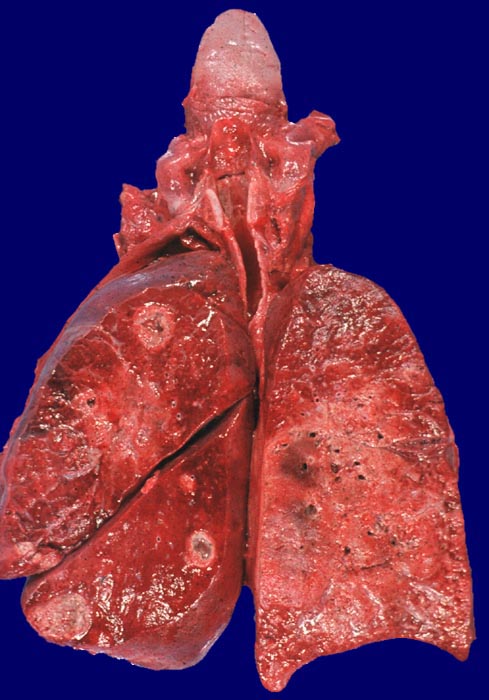 Die Lungen zeigen ein verfestigtes Parenchym mit mehreren runden zentral eingeschmolzenen Abszessen in den Lappen der linken Lunge.