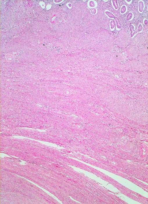Oben im Bild ist das Stratum basale des Endometriums erkennbar. Die endometranen Drüsen sind von einem artefiziellen Spaltraum umgeben. Daran angrenzend das Myometrium. Im Myometrium ist ein scharf begrenzter unbekapselter glattmuskulärer Tumor erkennbar.