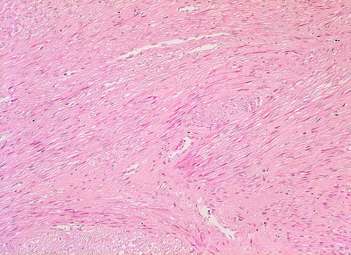 Die glattmuskulären Tumorzellen bilden geflechtartig verwobene, teils orthogonal, teils längs verlaufende Bündel. Zwischen den Tumorzellen verlaufen unterschiedlich breite zellarme Kollagenfaserzüge.