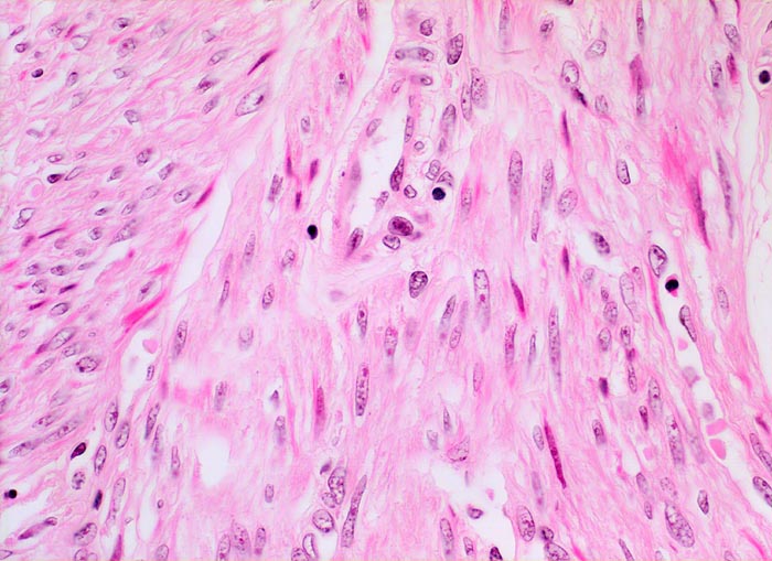 Die glattmuskulären Tumorzellen bilden geflechtartig verwobene Bündel. Zwischen den Tumorzellen verlaufen unterschiedlich breite zellarme Kollagenfaserzüge und dünnwandige Gefässe. Vereinzelte Entzündungszellen.