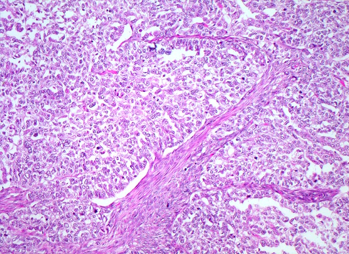 Vorwiegend solide zellreiche invasive Karzinomanteile. Zwischen den soliden Tumorzellplatten schmale Streifen von glatter Muskulatur des Myometriums.