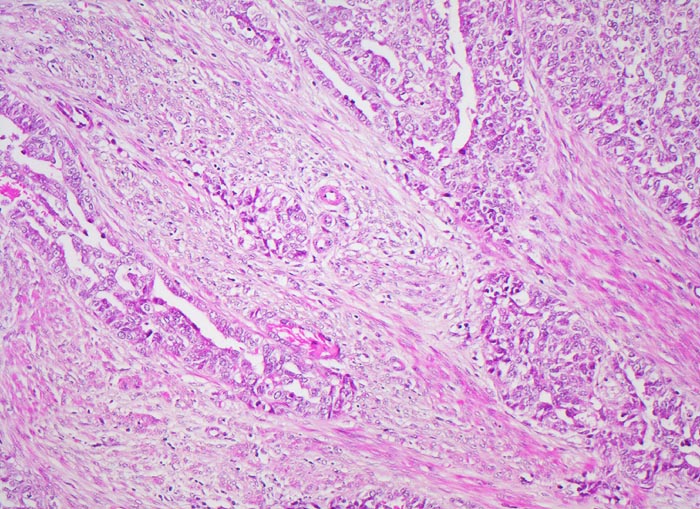 Teils solide, teils drüsenbildende Tumorzellverbände infiltrieren die glatte Muskulatur des Myometrium.