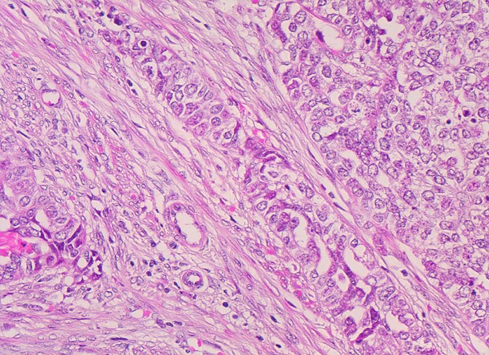 Solide Tumorzellverbände infiltrieren die glatte Muskulatur des Myometrium. Die Tumorzellen haben grosse runde vesikuläre Kerne und wenig Zytoplasma.