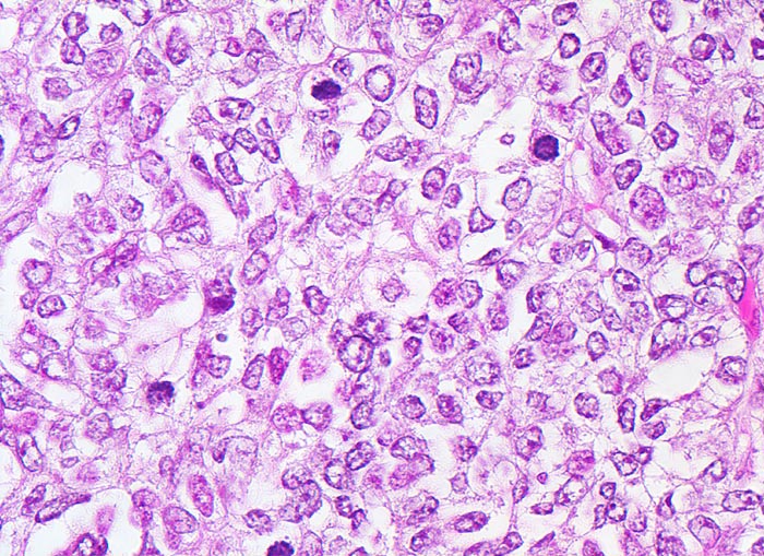 Solider Tumorzellverband. Die vesikulären (bläschenförmigen) Kerne sind polymorph und hyperchromatisch. Die Kernmembranen sind unregelmässig. Die Kern-Zytoplasmarelation ist erhöht. Mehrere Mitosen.