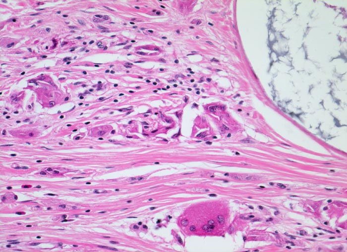 Fremdkörperriesenzellen mit phagozytierten Hornschuppen und Lymphozyten in fibrosiertem Stroma angrenzend an eine Pseudozyste ohne Epithelauskleidung.