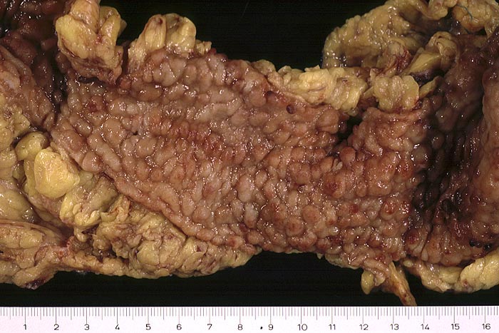 teils granulozytäre, stellenweise transmurale bis auf die Serosa reichende Entzündung. Multiple, teilweise angedeutet fissurale Schleimhautulzera. Multiple Kryptenabszesse mit perifokaler Becherzellreduktion, jedoch nur geringgradiger Störung der Architektur der Krypten. Umschriebenes tuberkuloides Granulom in