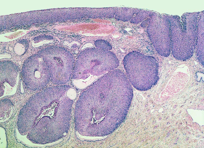 Das metaplastische Plattenepithel der Portio ist verdickt und erscheint aufgrund der erhöhten Zelldichte und der vergrösserten Kerne basophil. Eine Ausreifung der Zellen zur Oberfläche hin ist nicht erkennbar (=Cis). Das Carcinoma in situ wächst in vorbestehende endozervikale Drüsenschläuche ein.