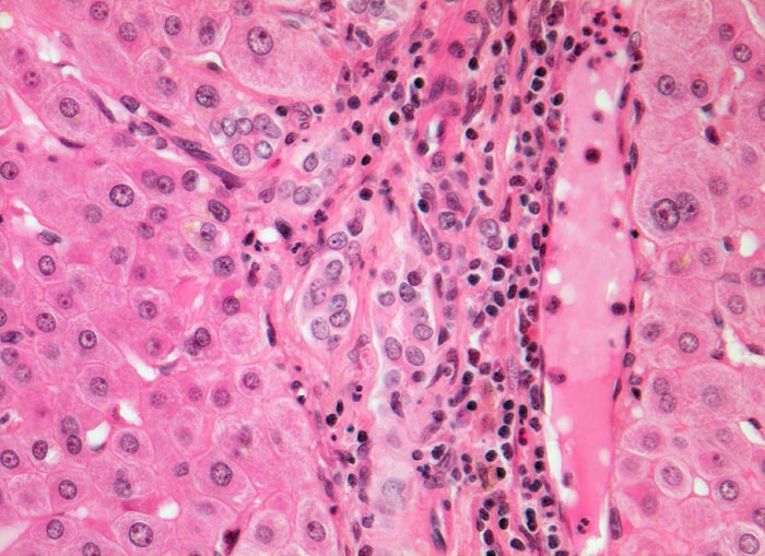 In der Zone 1 rund um das Portalfeld sind keine Galleablagerungen erkennbar. Das Portalfeld zeigt ein gemischtes Entzündungsinfiltrat. Am Rand des Portalfeldes proliferierte Ductuli umgeben von neutrophilen Granulozyten.